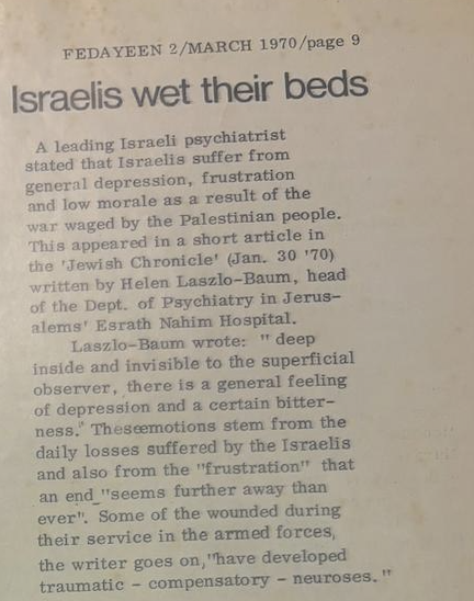 مقال من مجلة «الفدائيون» التابعة لحملة التضامن مع فلسطين في بريطانيا (1970).
